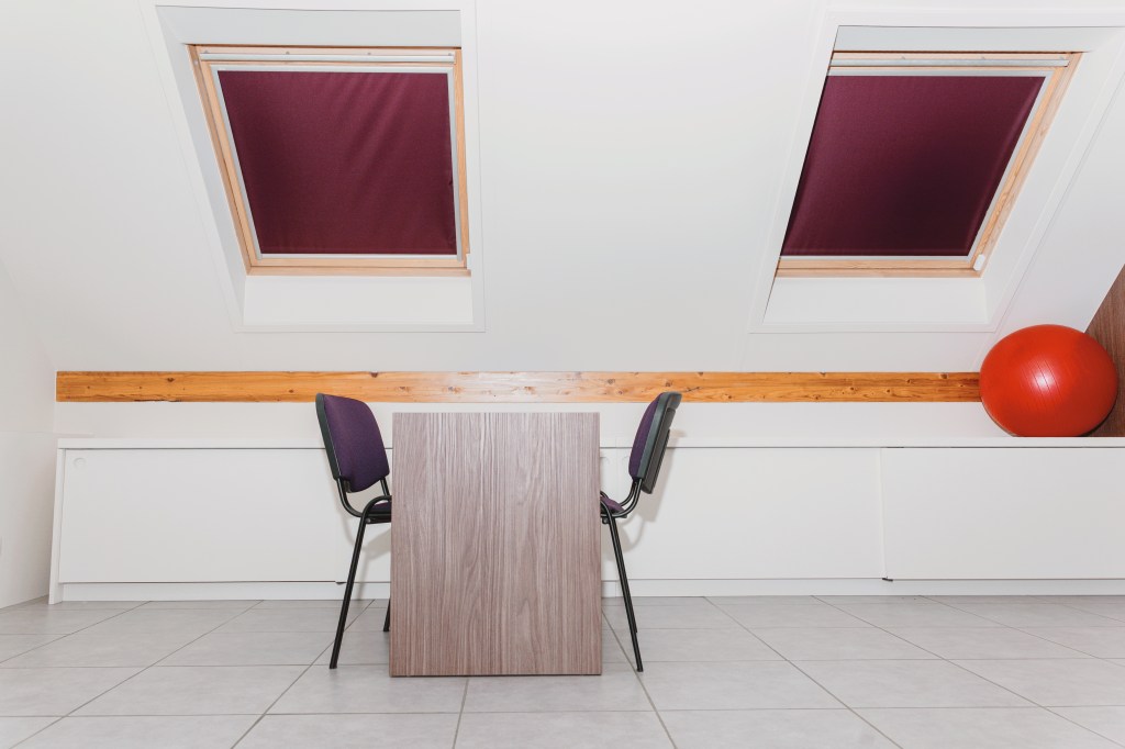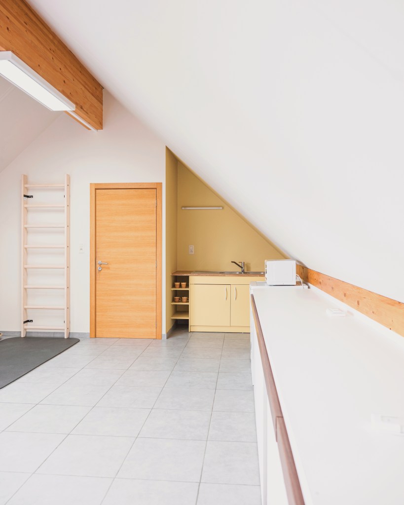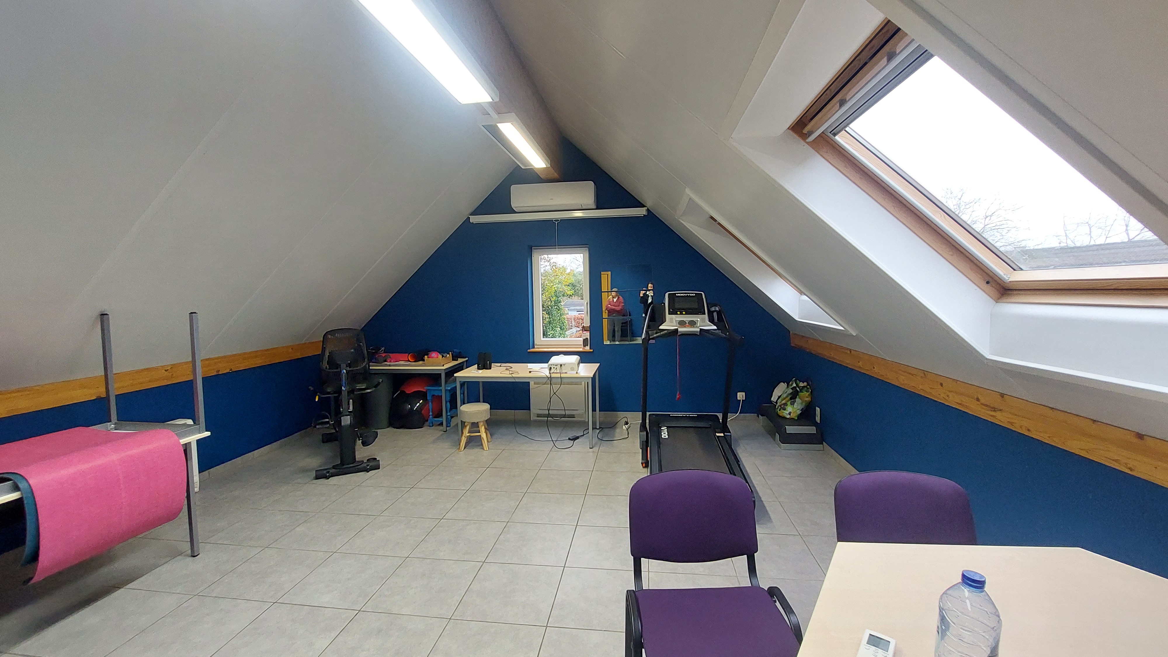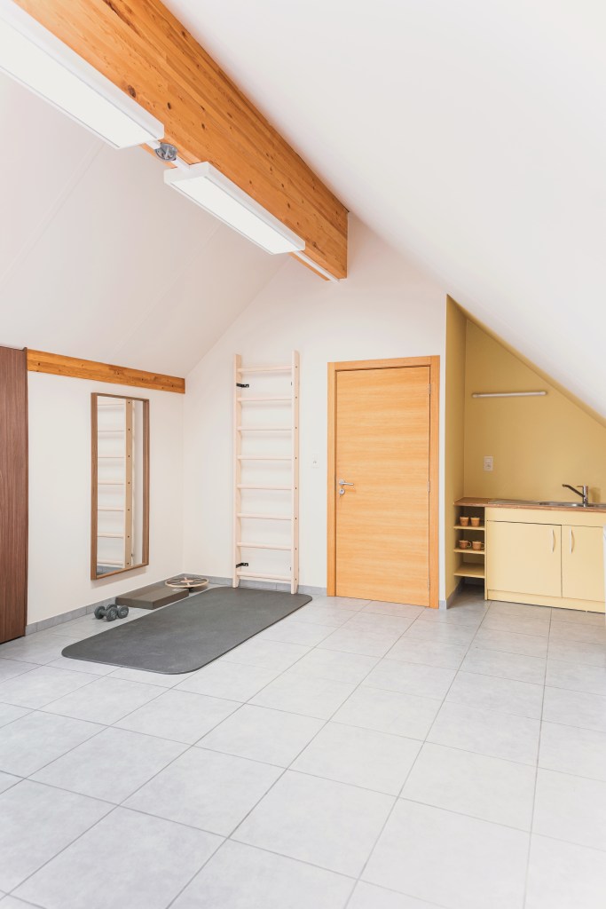 À Dolembreux, un cabinet de kinésithérapie a été entièrement repensé pour répondre à une double fonction : accueillir les patients au quotidien, et se transformer une fois par semaine en salle de réunion pour le personnel du centre médical.