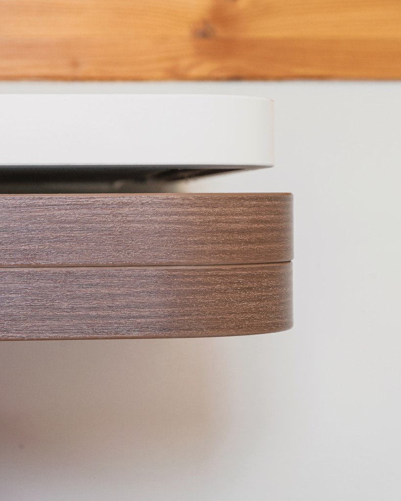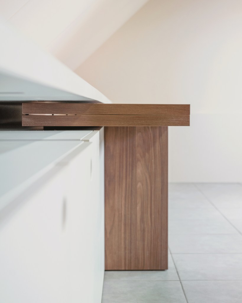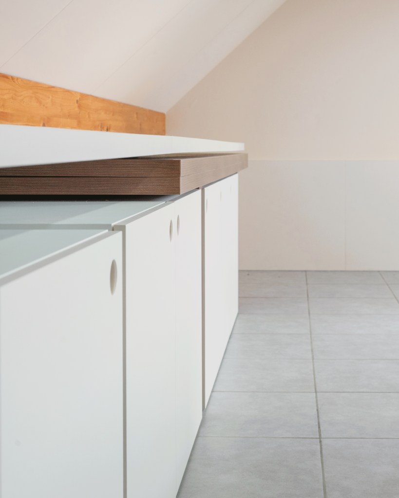 – Les deux grandes tables de réunion se plient et viennent se glisser dans le meuble de rangement principal.