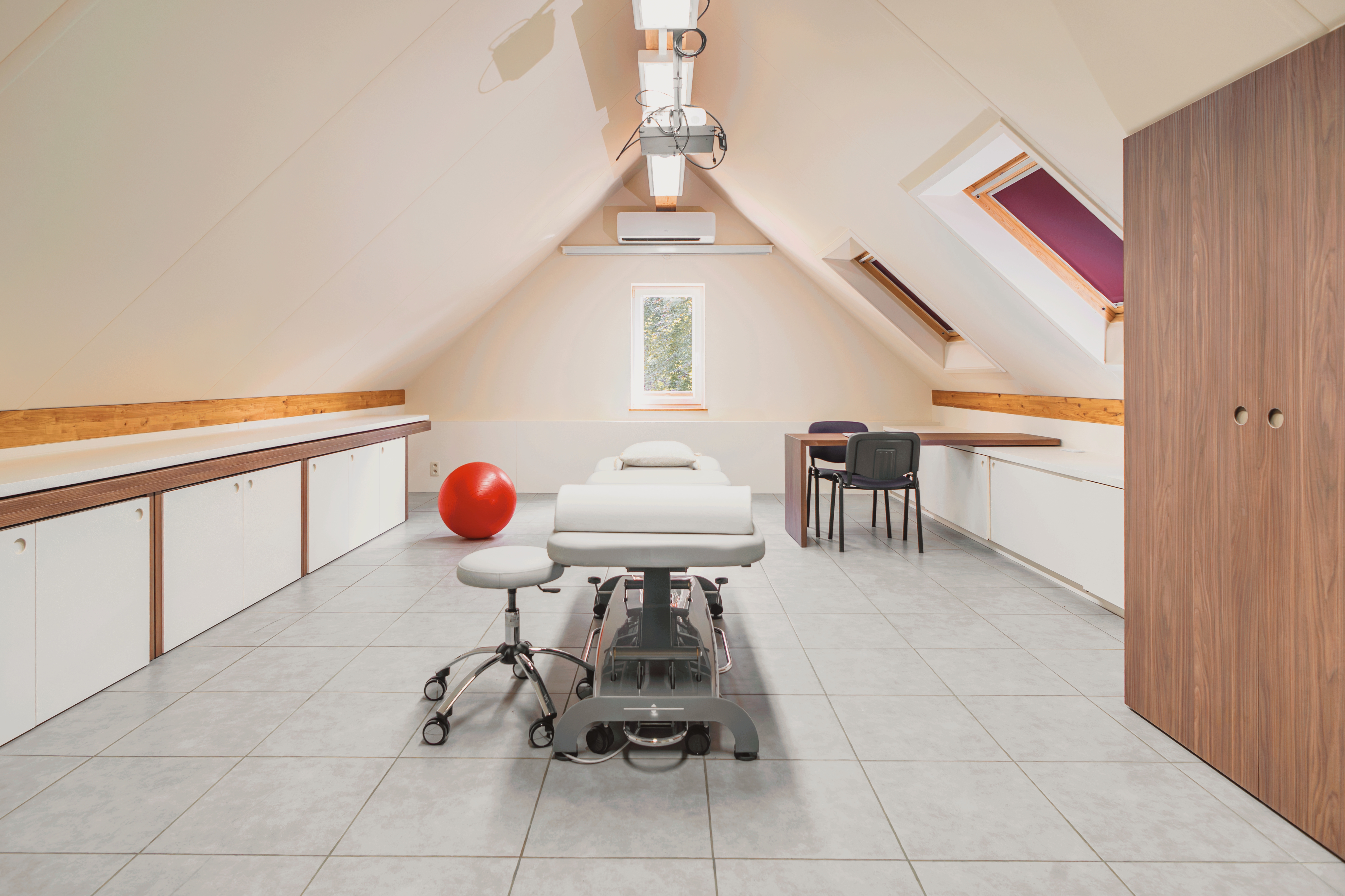 – Le bureau de consultation de kinésithérapie coulisse et se range lui aussi sur le mobilier, libérant l’espace au centre de la pièce.