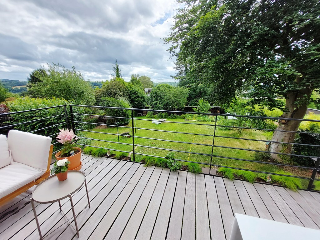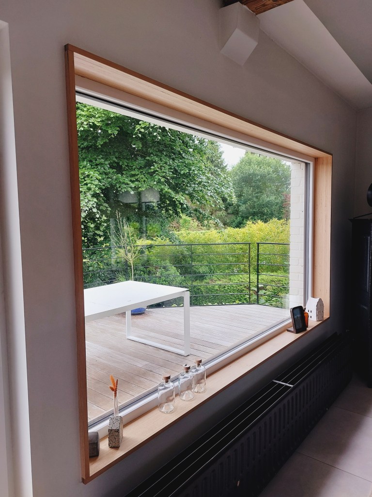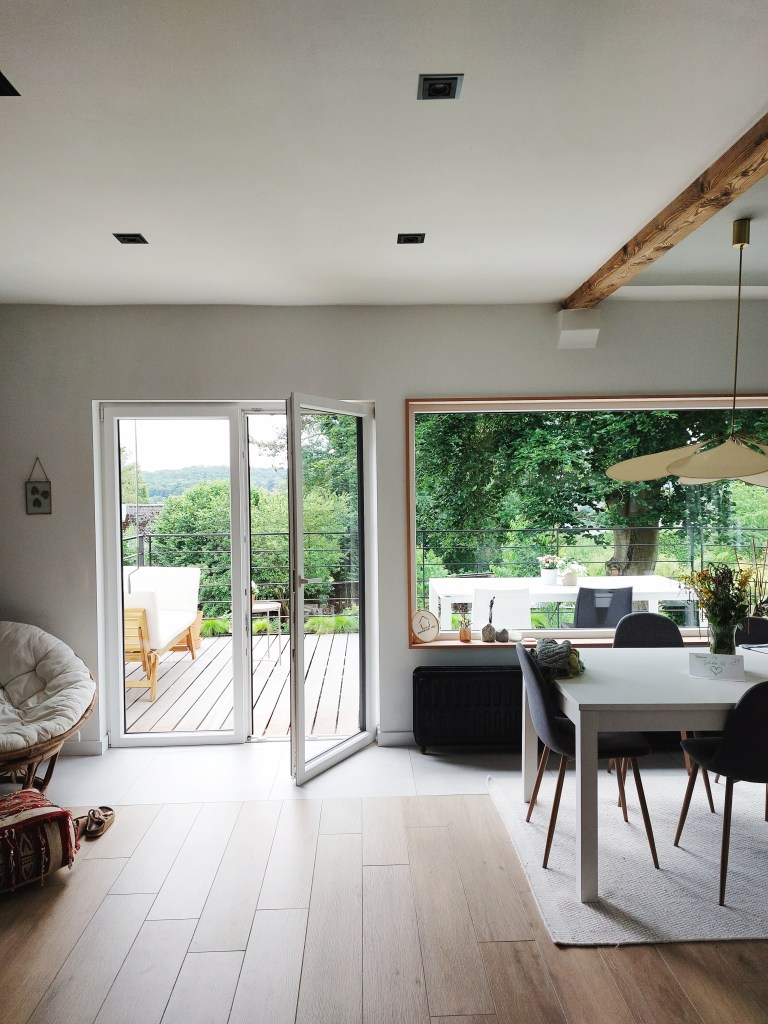 Parmi les éléments marquants, vous trouverez l’encadrement en ®Baubuche autour de cette fenêtre fixe qui la transforme en véritable tableau sur la nature.