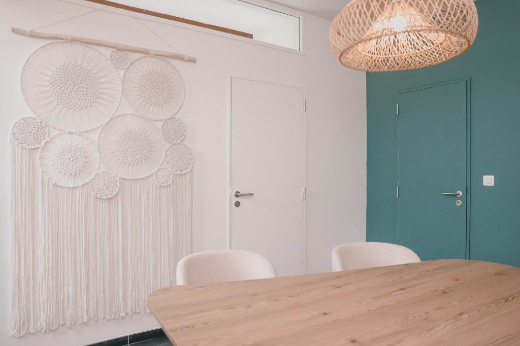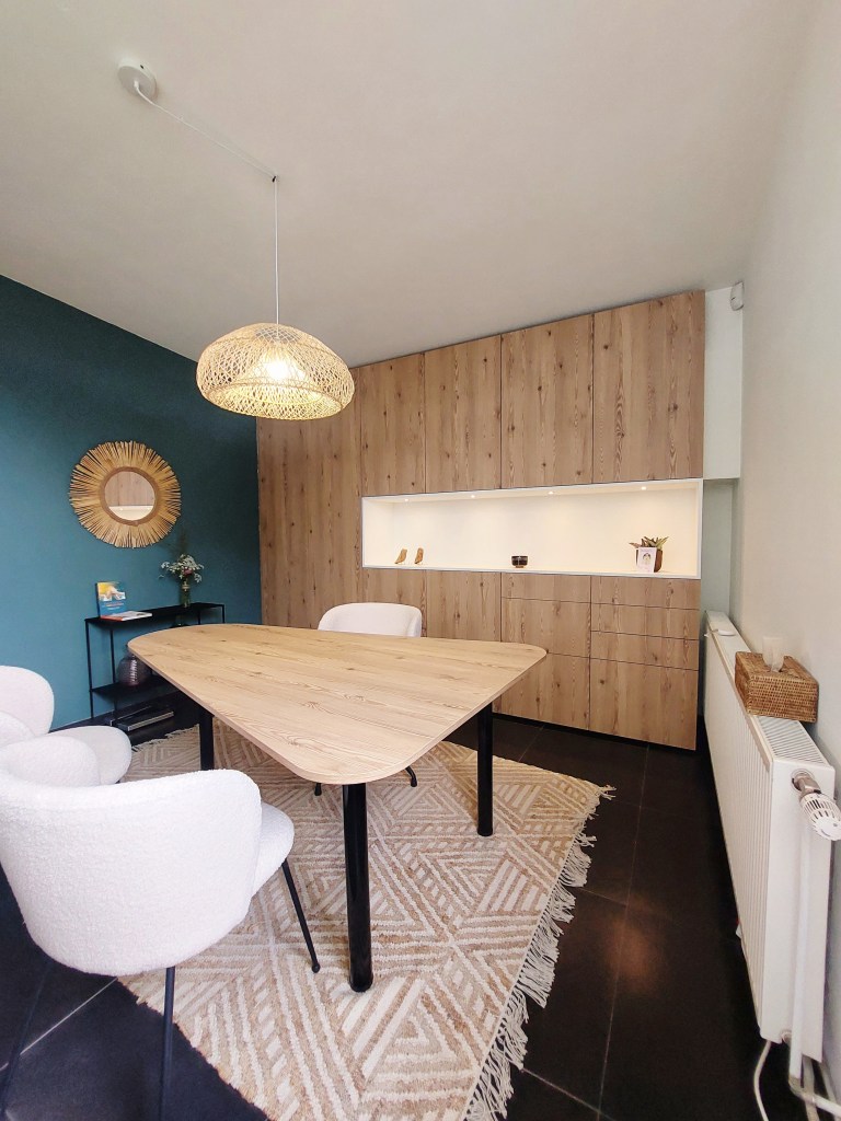 Pour cela, l’espace devait être divisé afin d’intégrer une salle d’attente, des WC et une salle de consultation, tout en conservant un maximum de lumière naturelle. Un véritable challenge en raison de la grande baie vitrée en coin, qui posait problème à la propriétaire quant à la disposition des pièces.